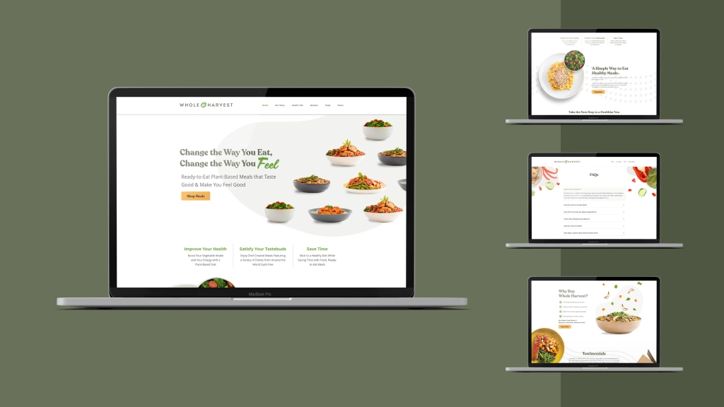 Partnered with Whole Harvest to elevate their brand identity for a nationwide launch. Built upon an existing logo to craft a comprehensive brand guide—defining color palette, typography, and visual language that emphasize freshness, simplicity, and trust. Led the design of the marketing website and all digital assets, and art-directed a 60-meal food photography shoot to capture honest, ingredient-driven dishes without artificial garnishes.